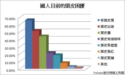 台灣夏季悶熱、冬季乾燥,頭皮問題多多,屬於敏感性頭皮的人,有逐漸增加的趨勢。根據波仕特線上市調網(http://www.pollster.com.tw)進行網路民調,顯示出59.32%的受訪者都有頭皮問題的困擾,再詳細調查有此困擾的受訪者,其中最多為「頭皮屑」(66.12%),其次是「頭皮出油」(51.58%)及「頭皮癢」(44.10%),少數受訪者則是「頭皮有油垢味」或「頭皮長痘痘」、「頭皮發紅」、「頭皮緊繃」等問題。