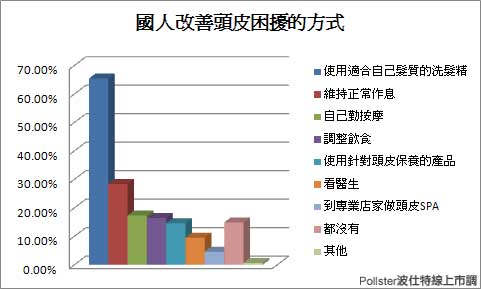 這當中男性有「頭皮屑」困擾又多於女性,而女性除了「頭皮屑」困擾外,在「出油」、「頭皮癢」等問題所占比例也較高。不論是頭皮的哪種困擾,敏感性頭皮只要做好日常的養護,其實就可降低換季時頭皮困擾的產生;在調查中受訪者對於改善頭皮困擾方式多為「挑選適合的洗髮精」占六成五,其次是「維持正常作息」占二成八,另外,在受訪者當中有17.30%會「自己動手按摩」、16.47%以「調整飲食」為主、14.64%會「使用頭皮保養的產品」、9.51%會選擇「看醫生」來解決,僅少數的受訪者會「至專業店家做頭皮SPA」。